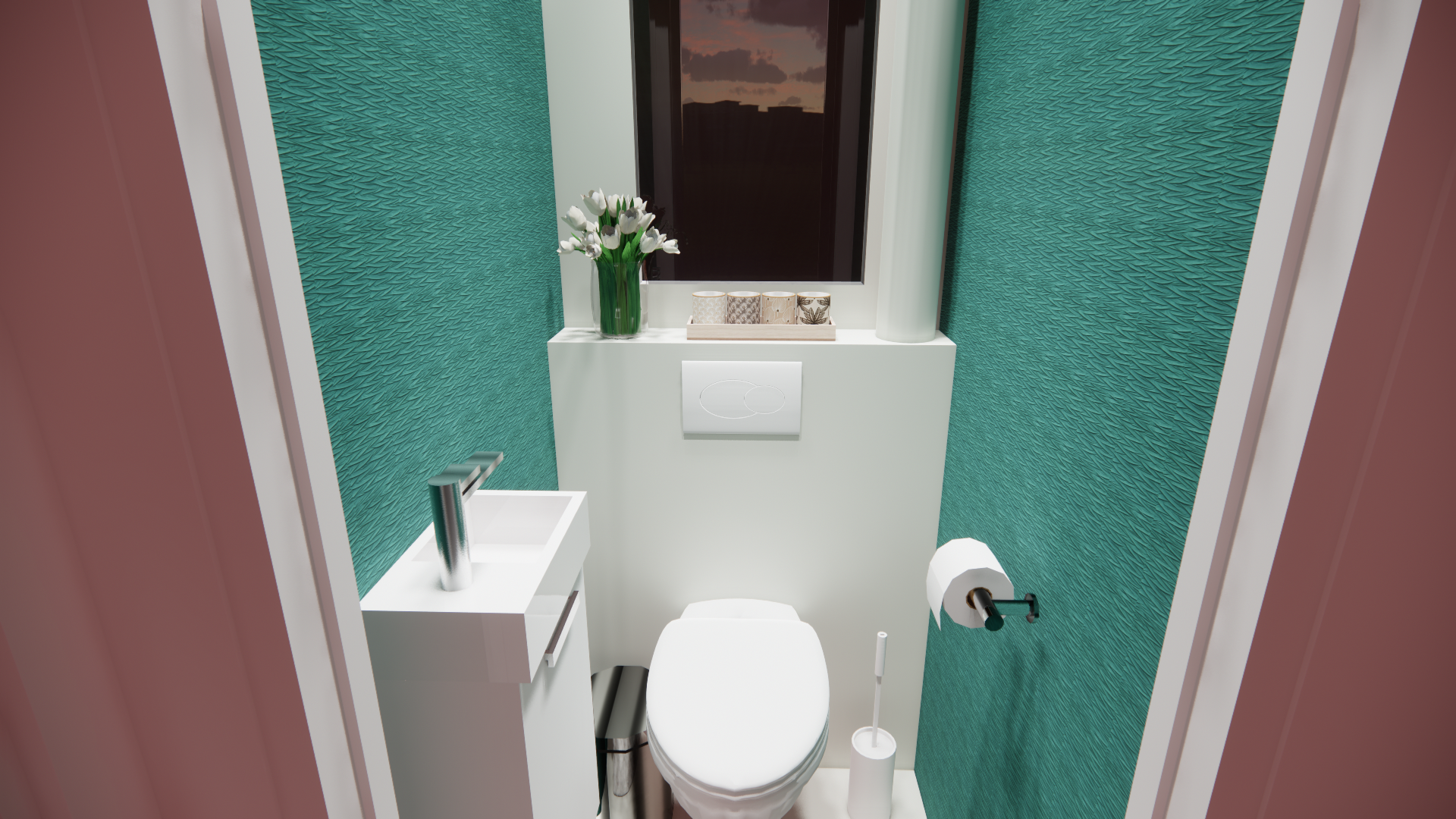 - la conception et décoration finale avec l'ajout du carrelage, de la tuyauterie et accessoires du côté douche ; des wc suspendus, du papier peint, un lavabo et accessoires pour la partie sanitaire.